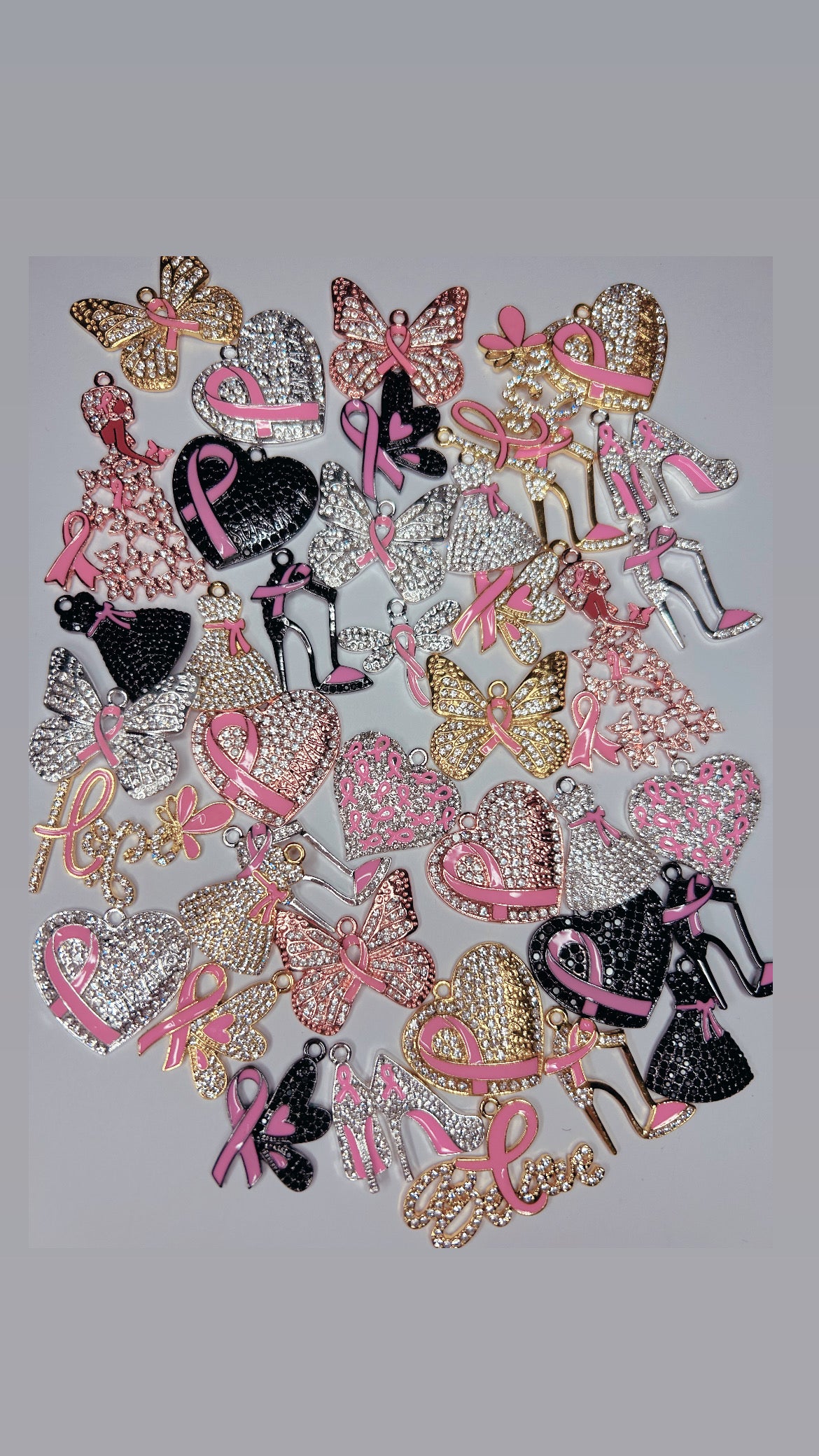 Check out our Bling breast, cancer, pink ribbon, jewelry making charms collection. Four colors of charms to choose from. These charms are hard quality and available for hand picks. Each charm is sold individually by the piece. It’s $2 per charm.