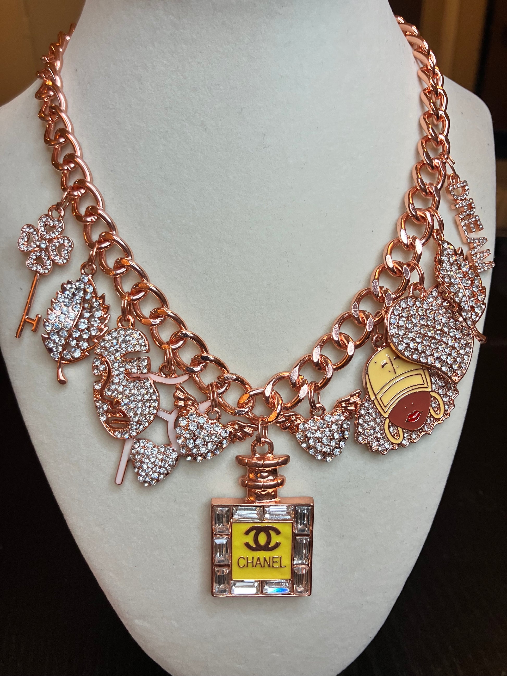 16 inch choker necklace. Yellow charms with rose gold metal and bling. Can be worn on any size of Women and teenagers.
